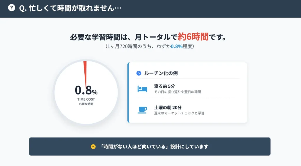 わからないところは、私自身が直接回答します。 だから誰でも、「自分でもできる!」を実感できる環境があります。