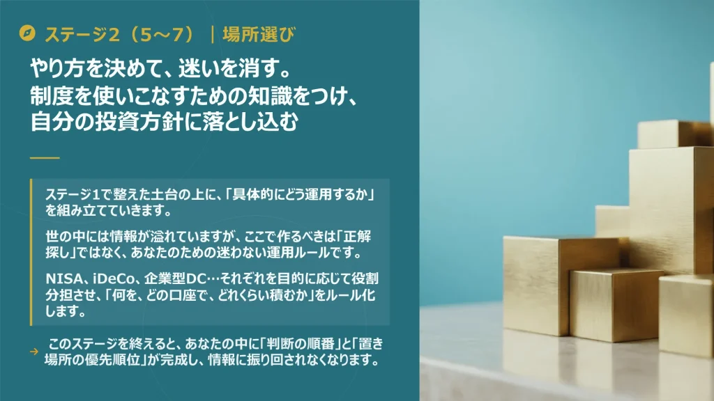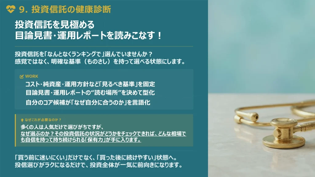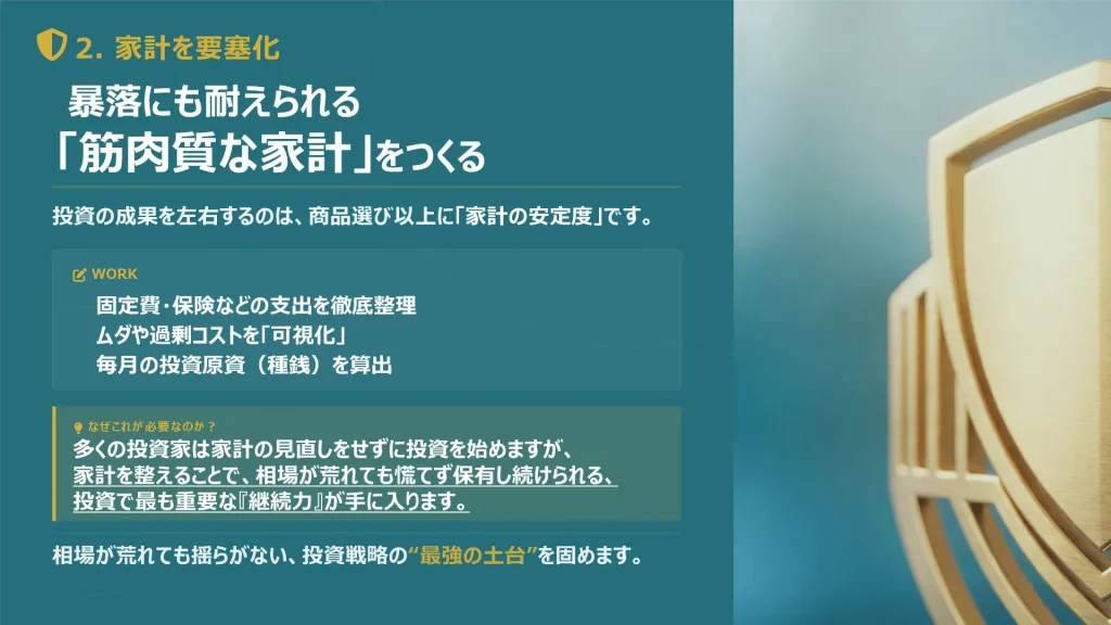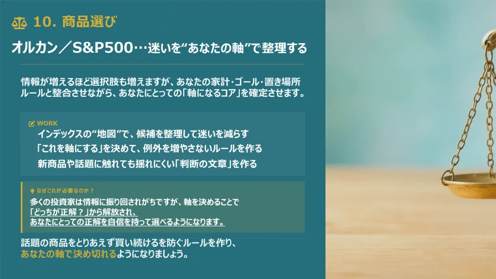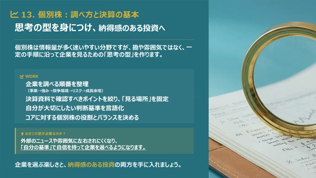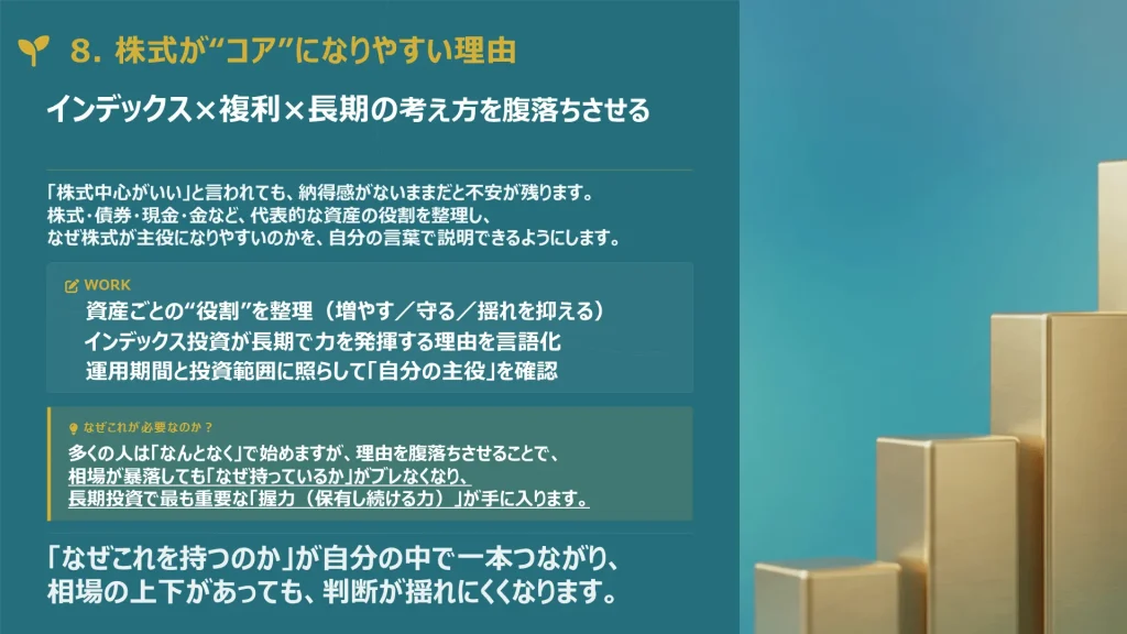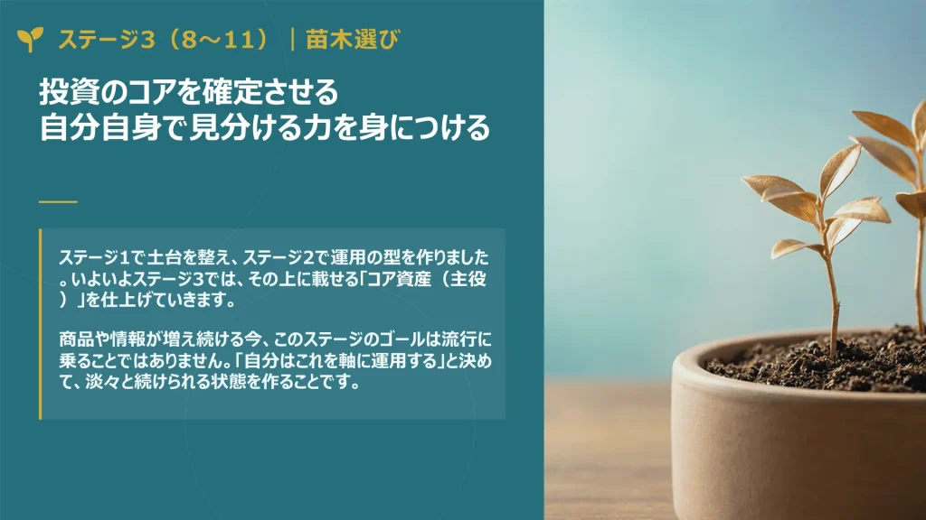 資産形成の核となる株式や投資信託の選び方を学び、迷わずに長期保有できる商品を選定します。