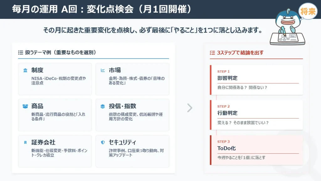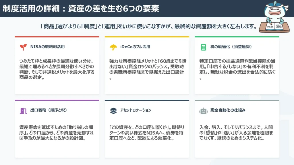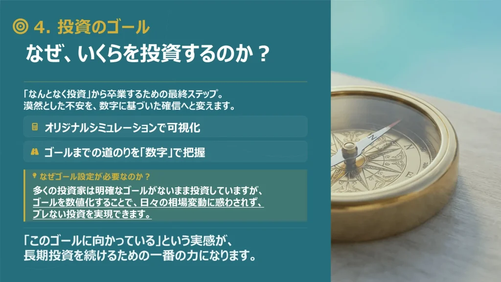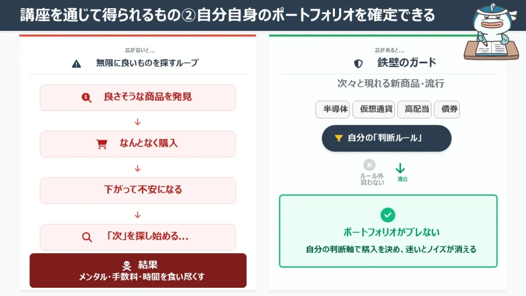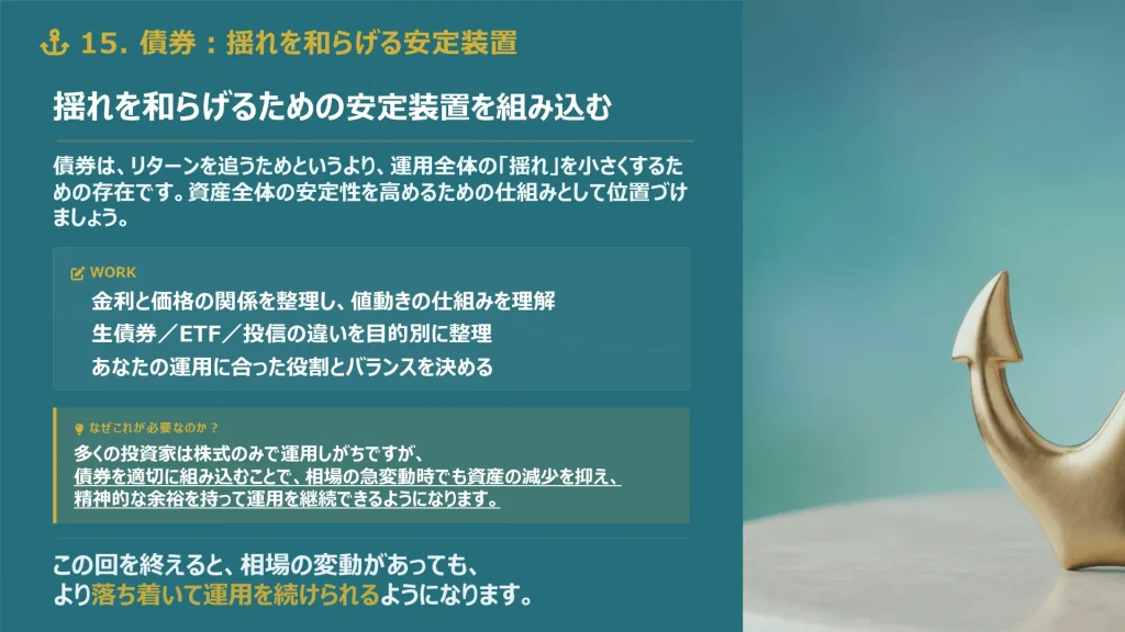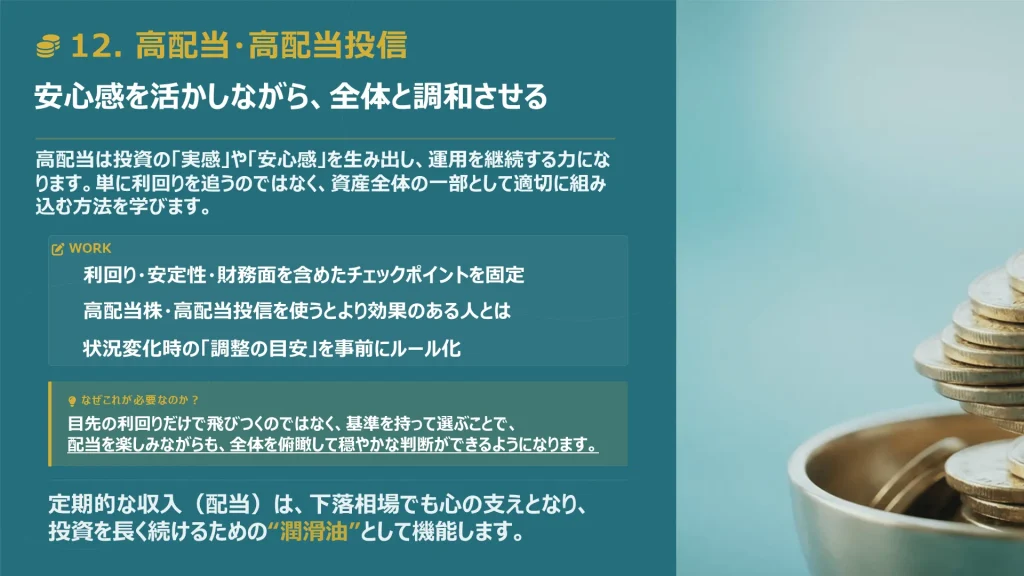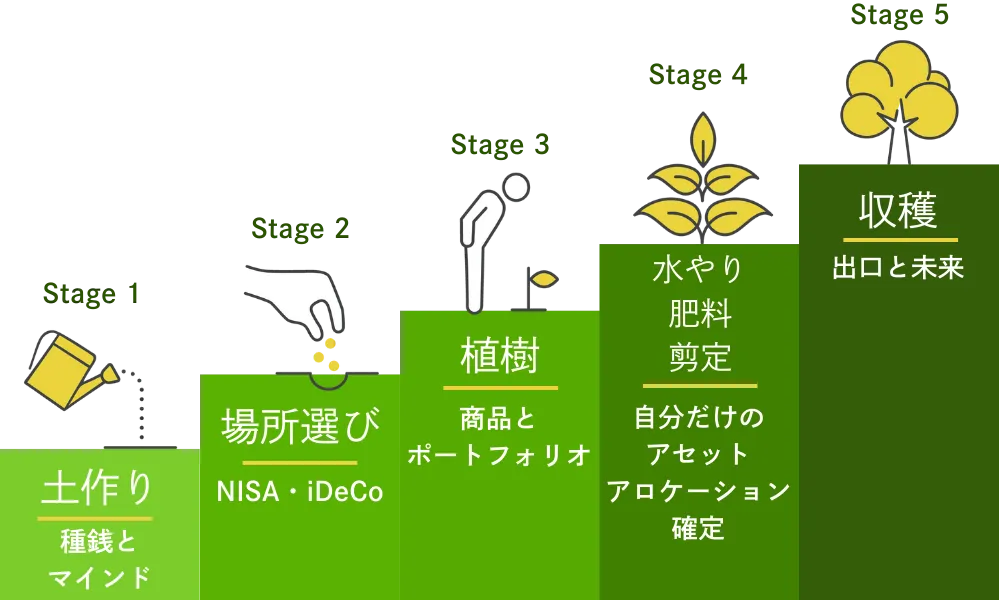 資産形成の核となる株式や投資信託の選び方を学び、迷わずに長期保有できる商品を選定します。