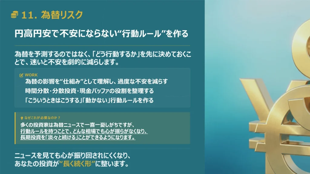 為替変動の仕組みを学び、値動きに動じないための投資のルールを作ります。