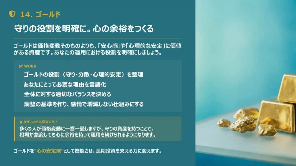 金や債券などで守りを固めつつ、自分だけのアセットアロケーション(資産配分)を完成させます。