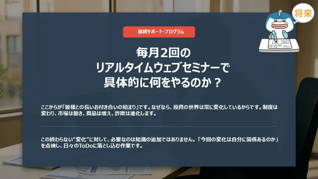 全24回の動画講義、そして月に2回を目安にタイムリーな相場変動や制度変更などを解説するワークショップの実施。