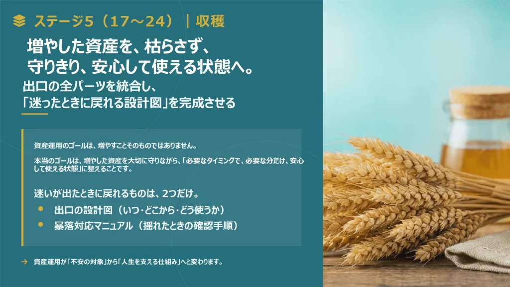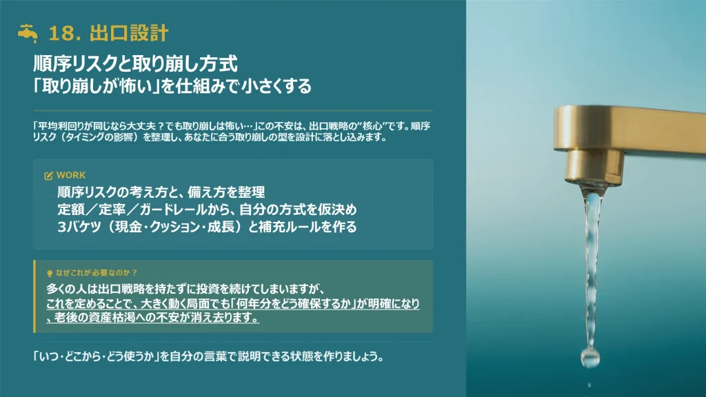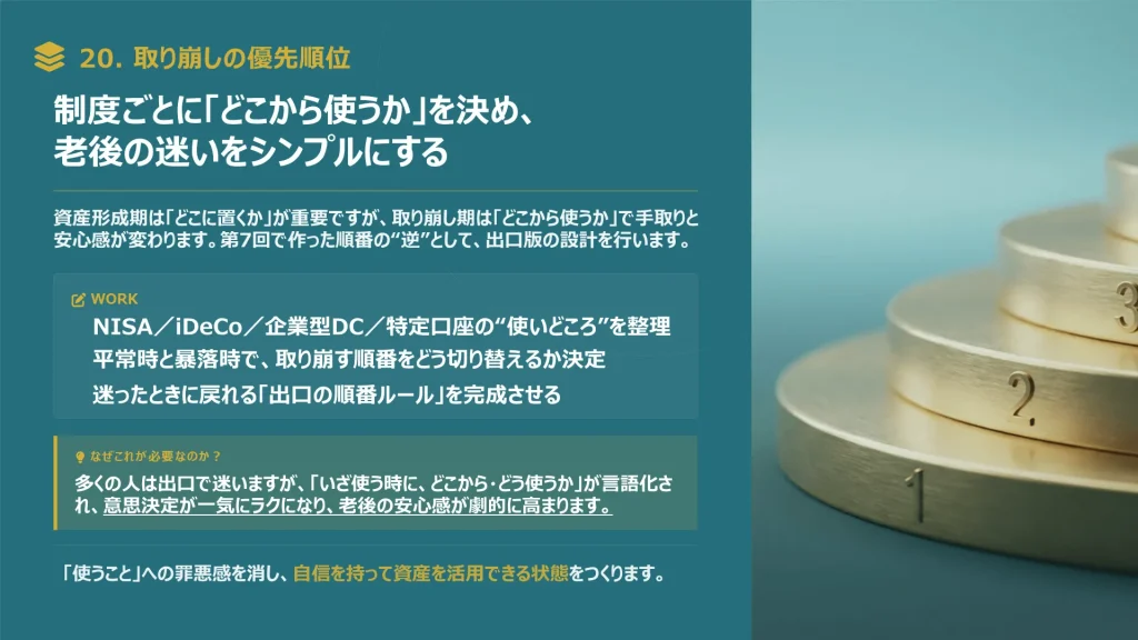暴落時の対応や老後の取り崩し方法を具体化し、一生迷わないための出口戦略と計画書を作ります。