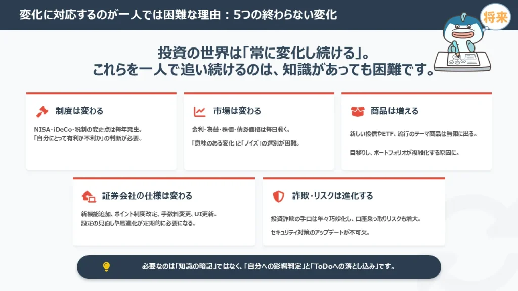 - NISAやiDeCoの、突然の制度改正や変更