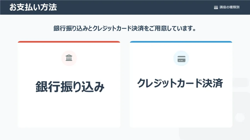お支払いはクレジットカード、銀行振り込み共に対応しています。
